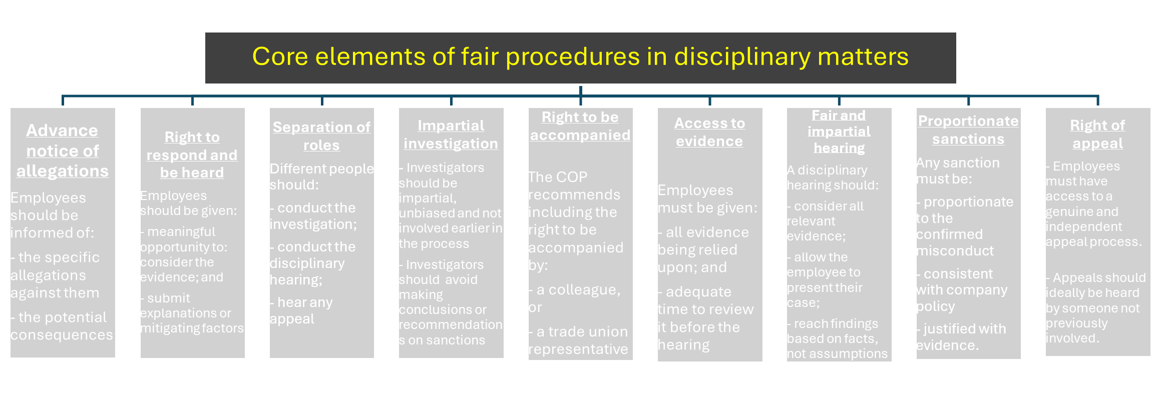 At its simplest, fair procedures require transparency, impartiality, and the opportunity to be heard. In practical terms, this includes: notifying employees of allegations; allowing time and access to evidence; conducting an impartial investigation; separating roles; ensuring a fair hearing; applying proportionate sanctions; and providing a genuine right of appeal. Below is a helpful overview of some of the core elements of fair procedures as established in Irish law and practice:
